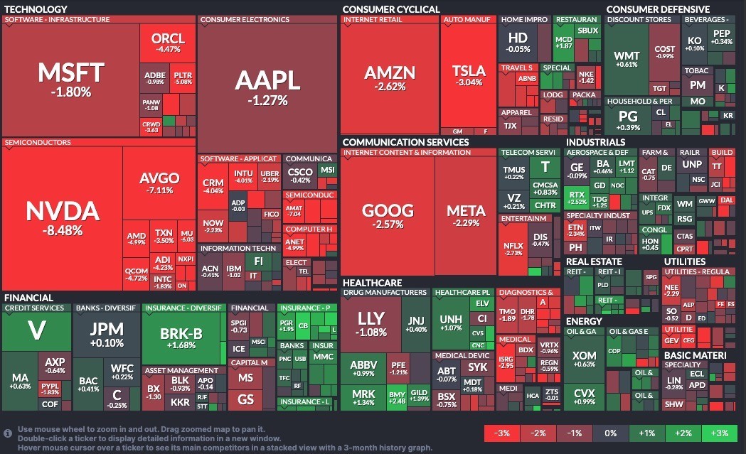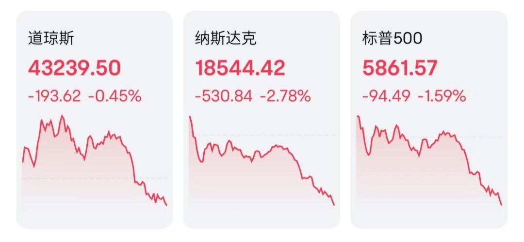 截至收盘,科技股占比较高的纳指领跌,跌幅超过 2.8%;标普500下跌近 1.6%;而道指下跌 0.4%。